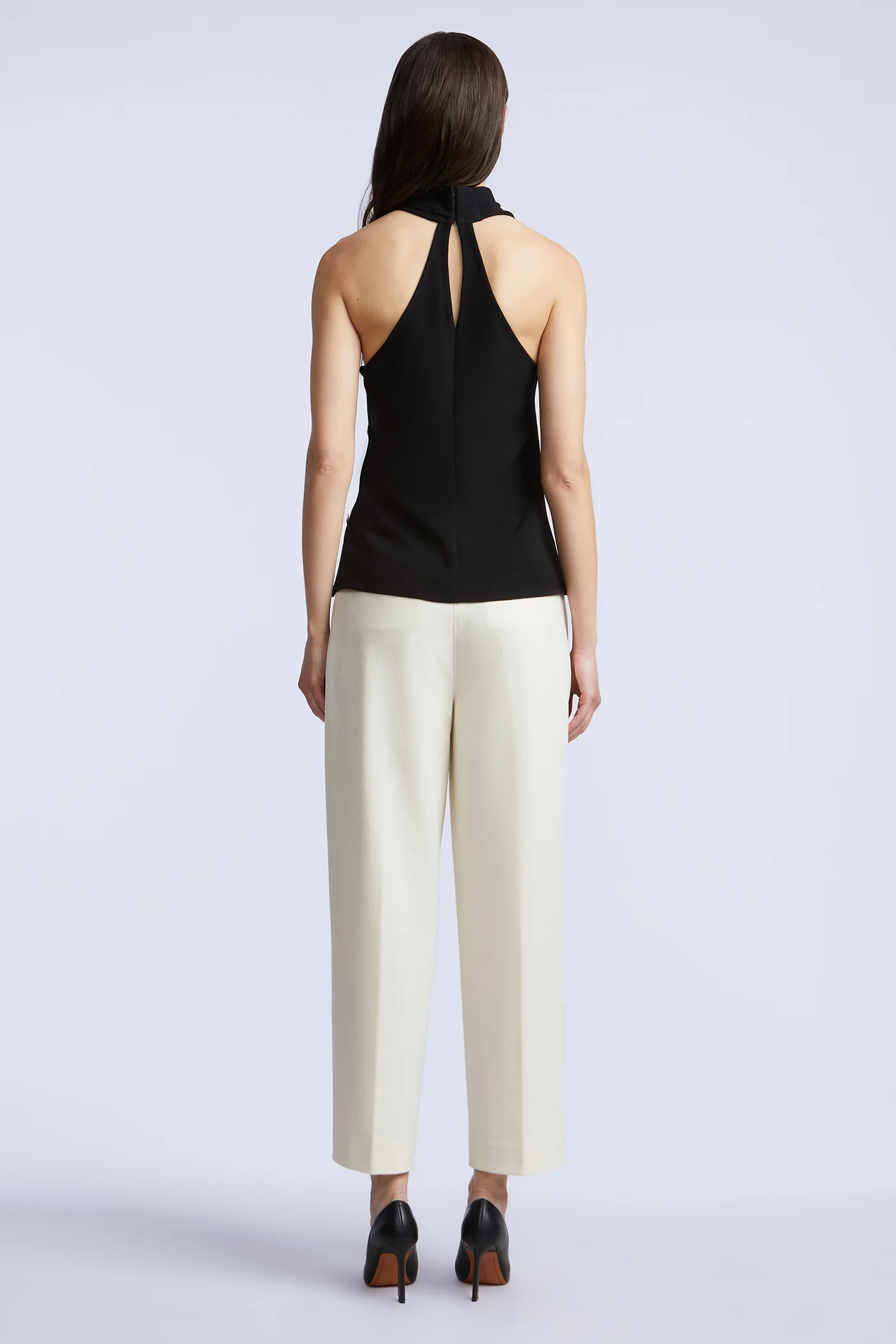Asymmetric halter top crafted in smooth crepe with a clean, modern drape. Finished with side button detailing for a subtle twist. An easy pick for work, dinners, and everything in between.