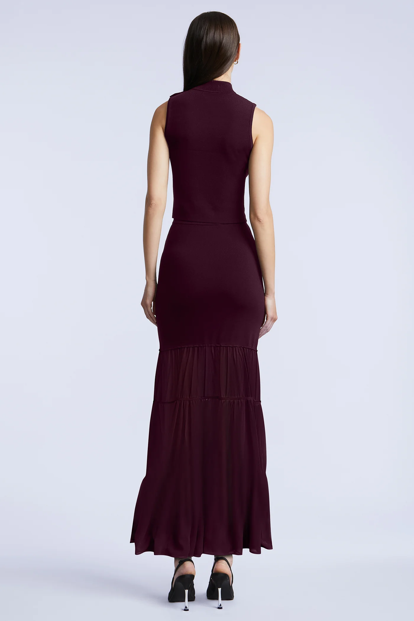 Soft stretch-knit skirt spliced with sheer chiffon tiers for movement. Sculpted through the hips, then flares with a fluid, layered finish. A polished pick for nights out, gallery plans, and winter dinners.