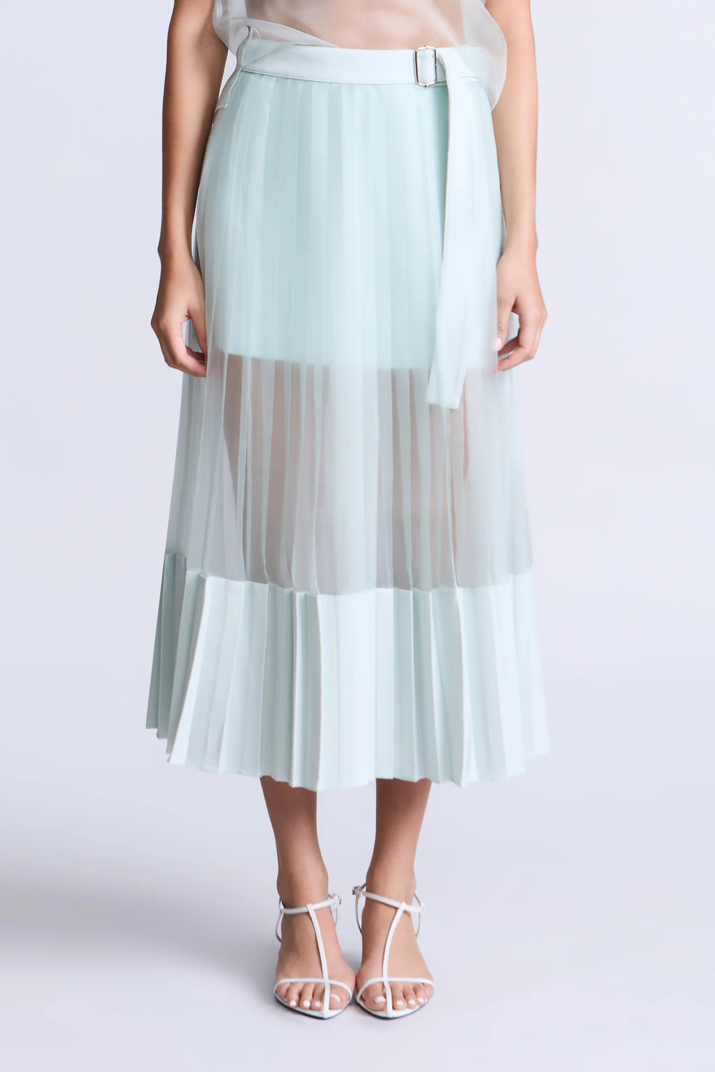 Softly pleated midi skirt in an airy aqua hue, designed to move with lightness and flow. Cut with fluid volume and a clean waistband for an easy, polished finish. An effortless match for warm-weather days, garden events, or dressed up after dark.